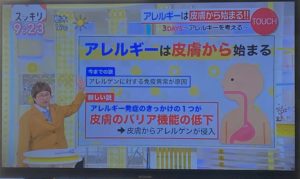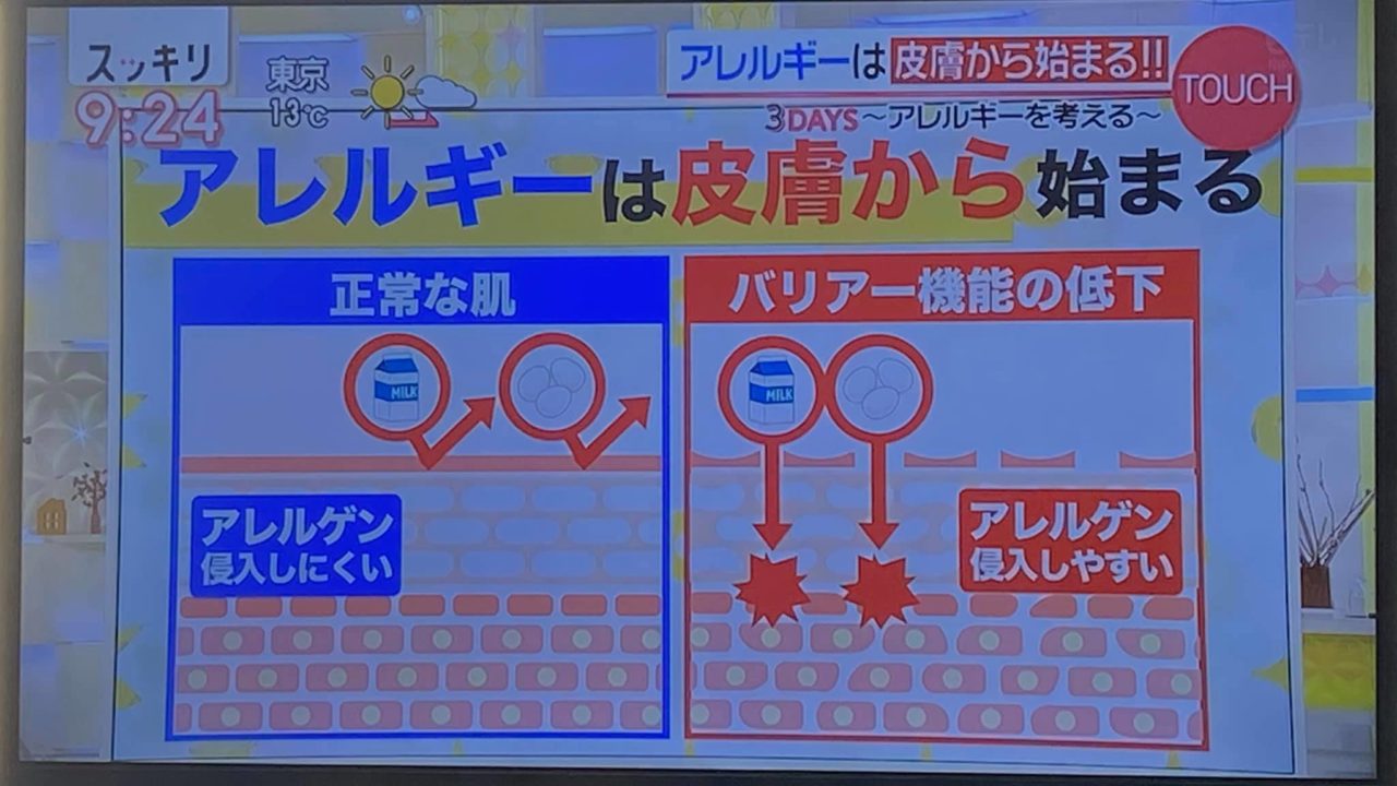 スキンケア アレルギーは皮膚から始まる yamadatomoko 2020年8月6日 2020.02.19放映の【スッキリ】より 「アレルギーは皮膚から始まる」とのこと。 皮膚のバリア機能の低下によって、アレルゲンが【皮膚から】侵入してゆく。 正常な肌である方がその侵入を防げる。 とのことでした。