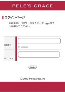 ログイン情報は、ペレ・グレイスからの初回のお荷物に同梱されている、『Webサービス 会員番号等のご通知』に記載されています。大切に保管してください。